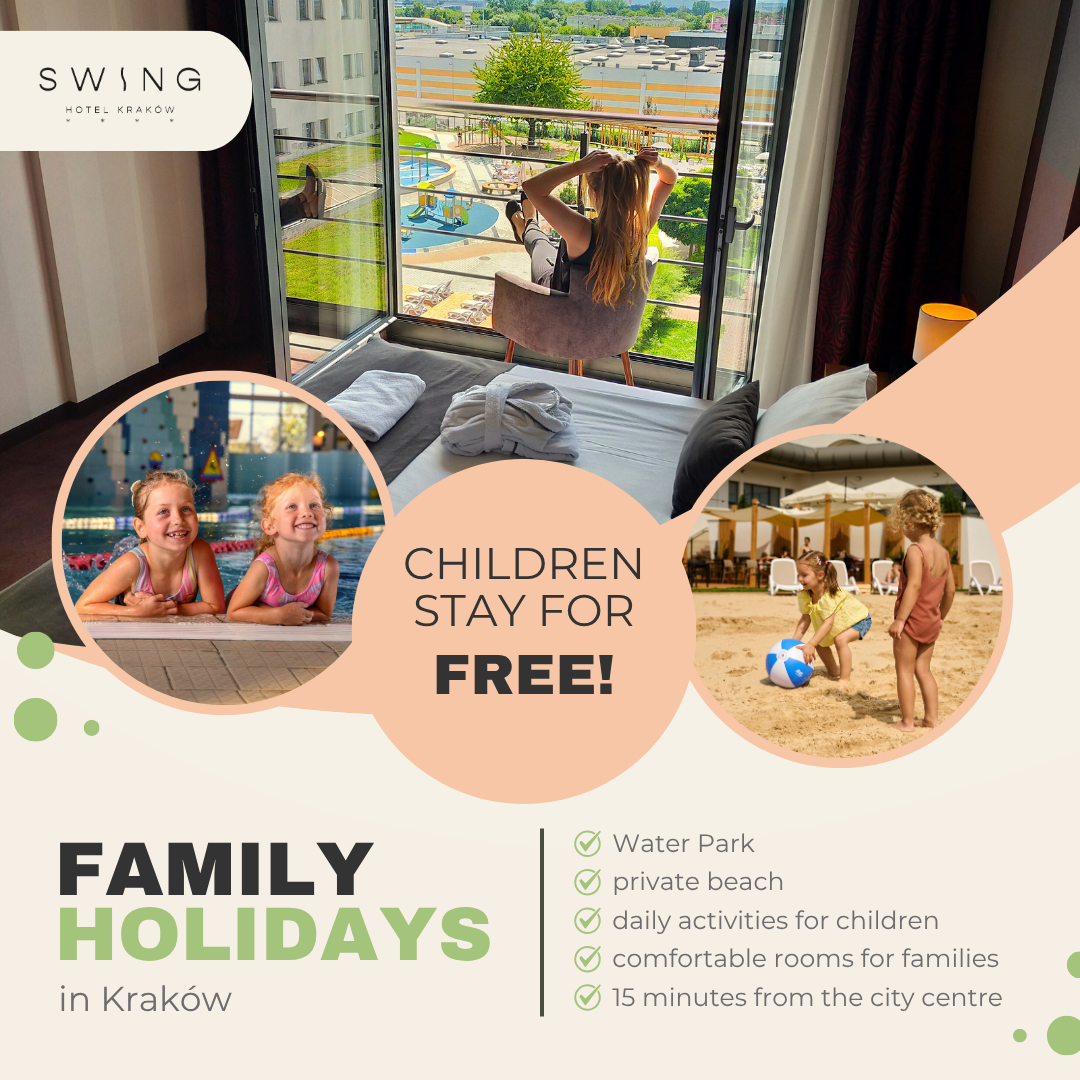 Plan your dream family holidays in Kraków! Are you dreaming of an unforgettable summer stay that will delight both you and your little ones? Welcome to Hotel Swing**** in Kraków, located right next to the Water Park and offering access to Stacja Parkowa Beach – the only place of its kind in Kraków, featuring two sandy beaches, a water playground, and plenty of attractions for the whole family.