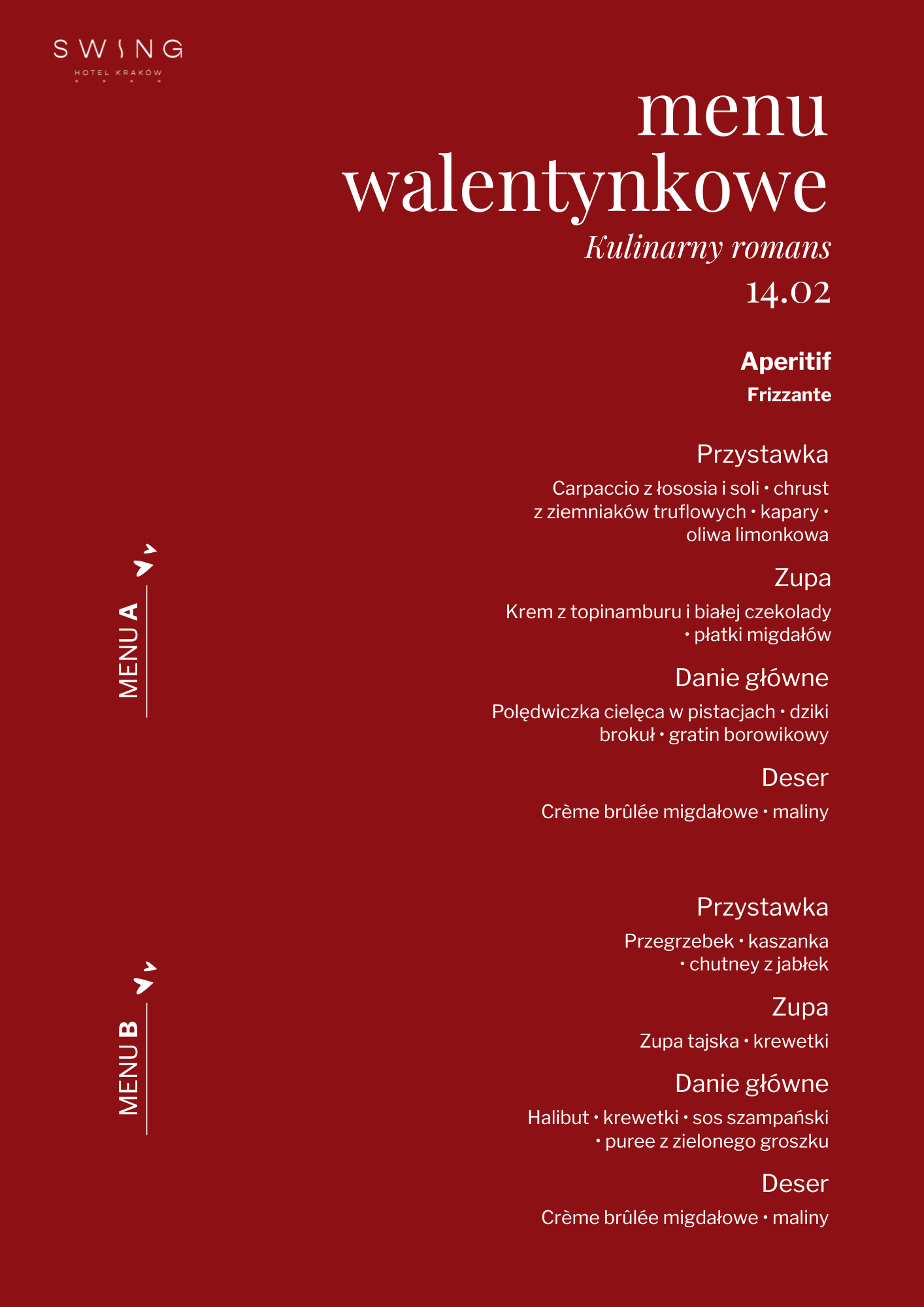 Na ten szczególny wieczór przygotowaliśmy dwa zestawy degustacyjne - Menu A i Menu B. To propozycje łączące świeże składniki, ciekawe kompozycje oraz lekkość nowoczesnej kuchni. Ugościmy Was aperitifem, przystawką, zupą, daniem głównym oraz deserem.