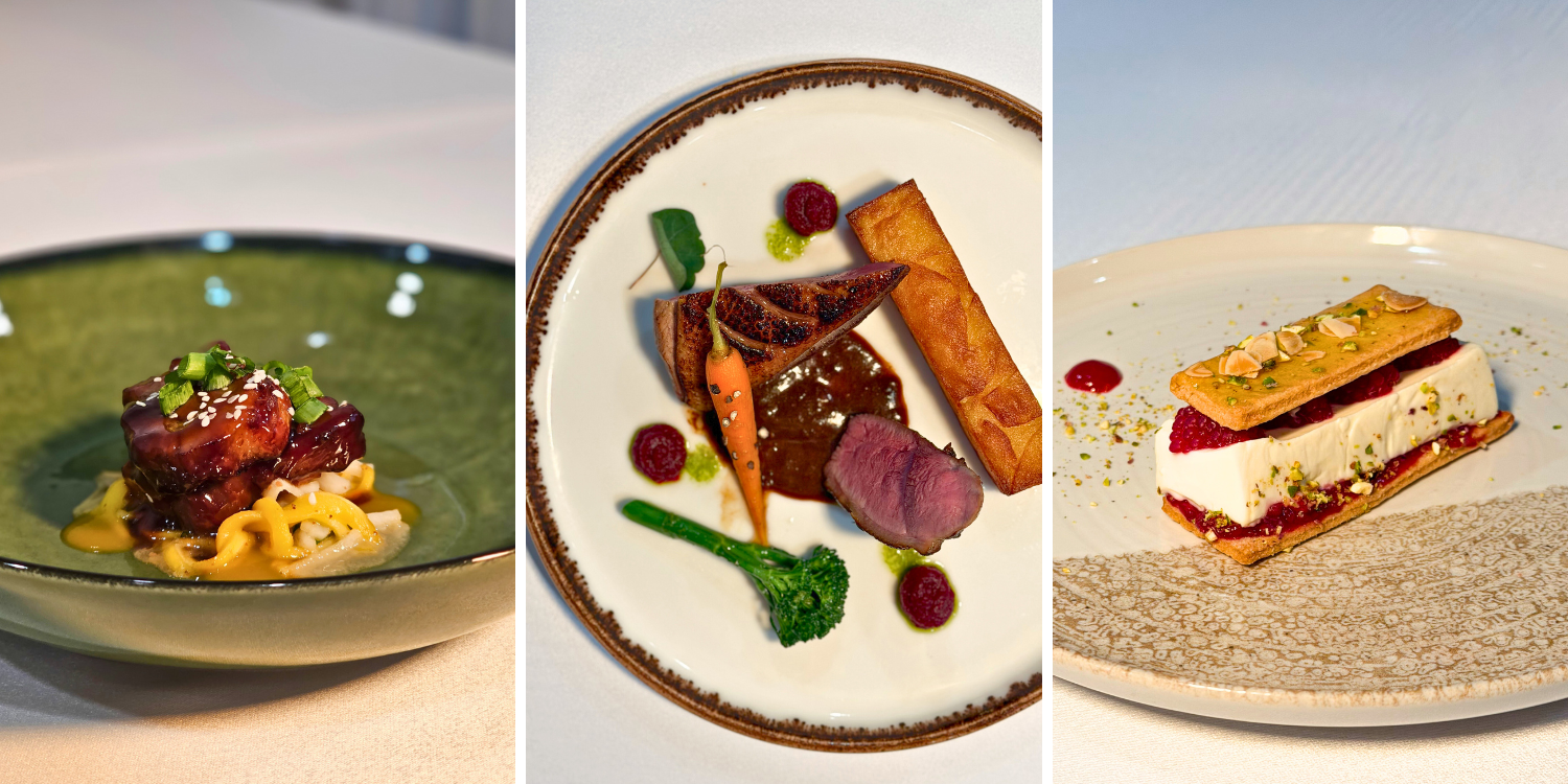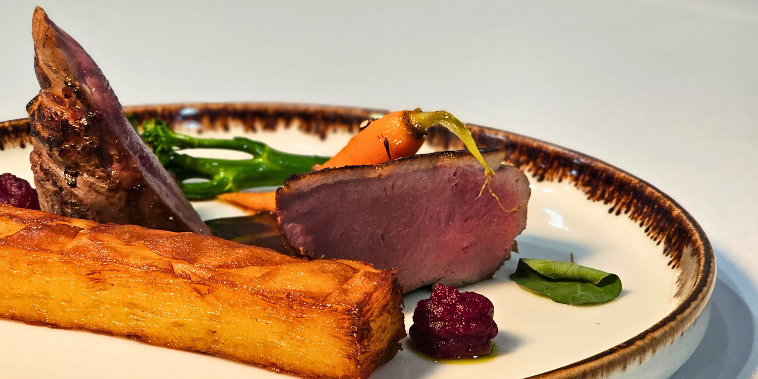 Danie główne: Soczysta pierś z kaczki sous vide, gratin ziemniaczane, dziki brokuł i młoda marchewka, aksamitne purée z buraka, oliwa pietruszkowa oraz klasyczny demi-glace z nutą tymianku.