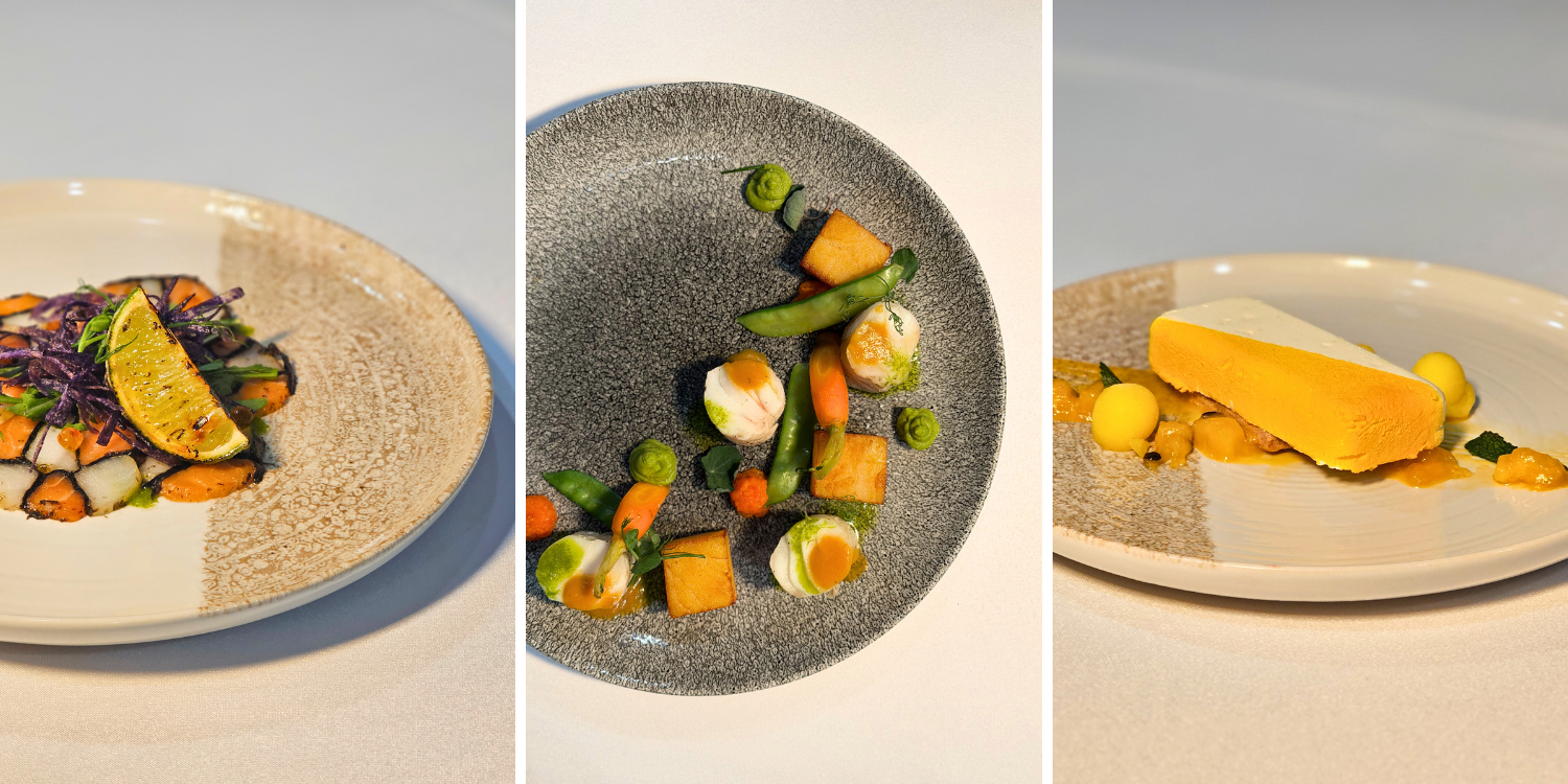 Danie główne: Delikatna polędwiczka z dorsza, gratin ziemniaczane, purée z groszku i marchewki, chrupiący groszek cukrowy i młoda marchewka, intensywna oliwa z czosnku niedźwiedziego oraz aromatyczny sos z langustynek.